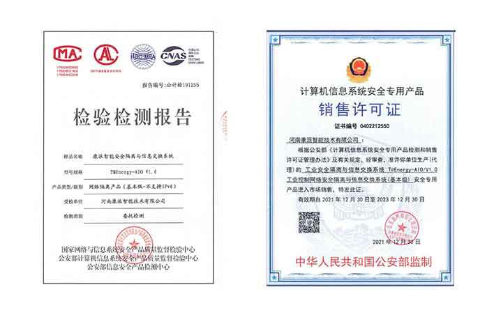 能耗在線監測端設備按照GB/T20279《信息安全技術網絡和終端設備隔離部件安全技術要求》的相關規定,通過第三方認證,同時取得了《公安部技術機信息系統安全產品質量監督檢驗中心檢驗報告》和《計算機信息系統安全專用產品銷售許可證》。