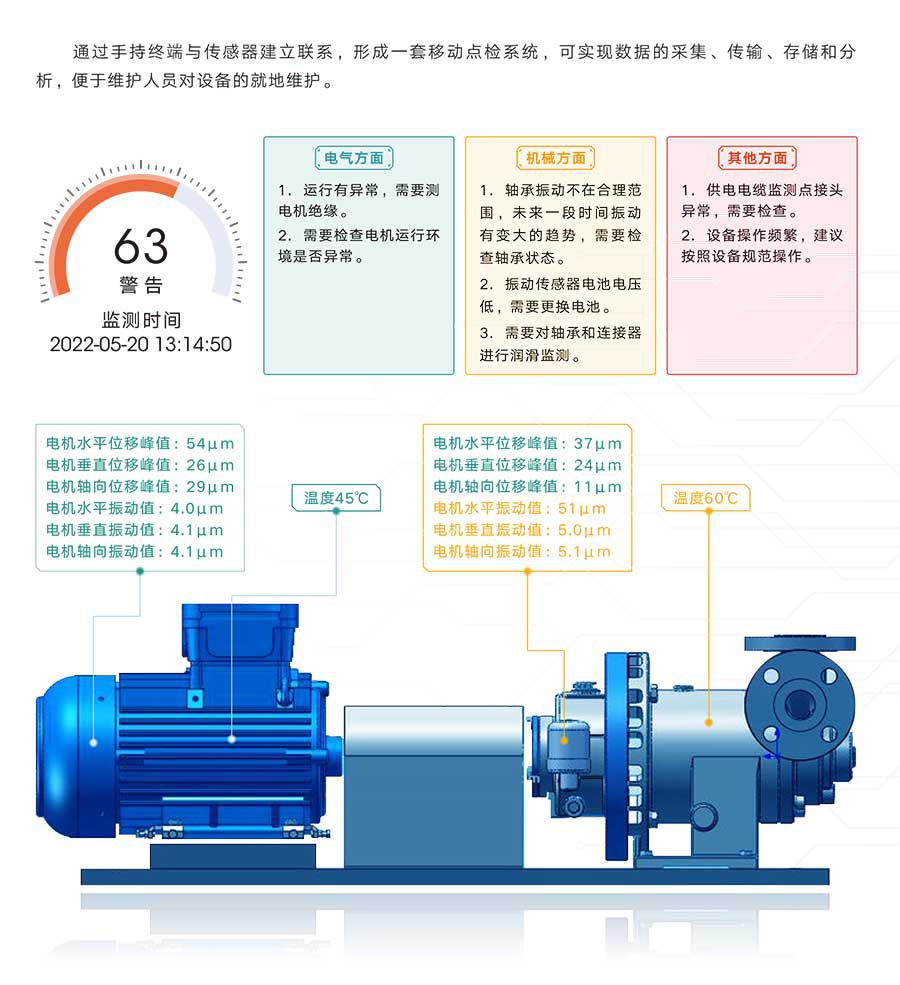 設備健康管理系統是一款針對旋轉機械推出的工業級設備健康管理系統,搭配無線智能傳感器與智能數據采集器,以智能診斷為核心,集數據采集、狀態監測、實時報警、綜合分析、綜合評價、大數據預警等功能為一體,通過對關鍵機組及重要機泵進行狀態監測,做到形象直觀、深入淺出地展現設備的健康狀況和運行趨勢,精準捕捉設備異常狀態,及時判定故障原因及部位,輔助進行維修決策,在避免關鍵設備停車給企業造成經濟損失的基礎.上,大幅提升機組效能。