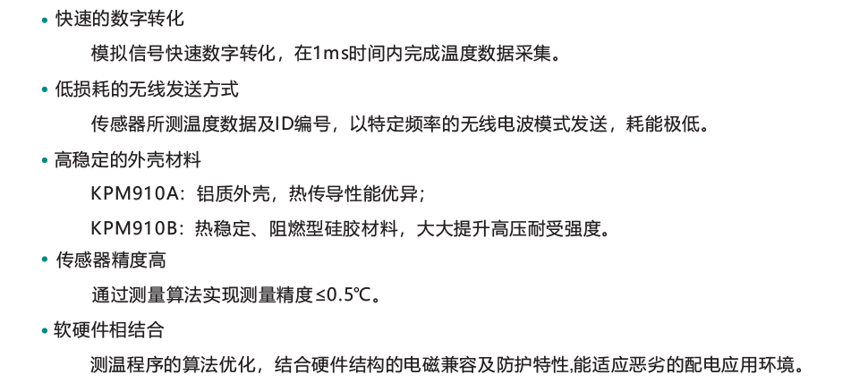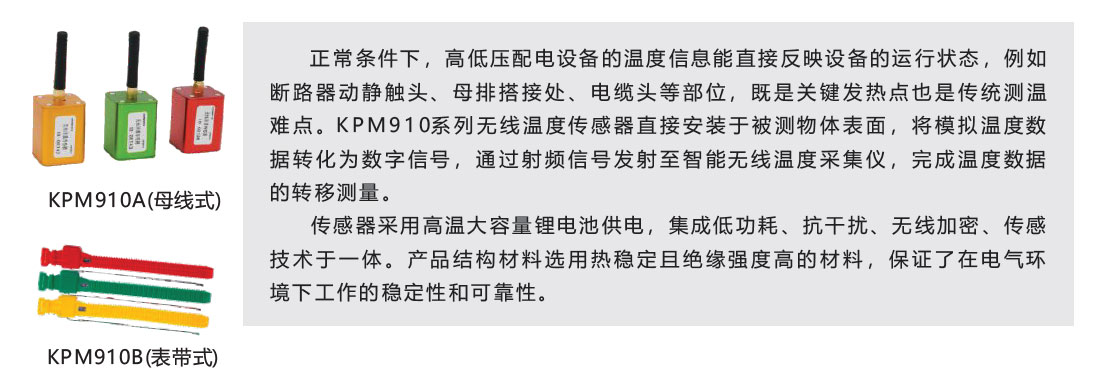 正常條件下,高低壓配電設備的溫度信息能直接反映設備的運行狀態,例如斷路器動靜觸頭、母排搭結處、電纜頭等部位,既是關鍵發熱點也是傳統測溫難點。KPM910系列無線溫度傳感器直接安裝于被測物體表面,將模擬溫度數據轉化為數字信號,通過射頻信號發射至智能無線溫度采集儀,完成溫度數據的轉移測量。