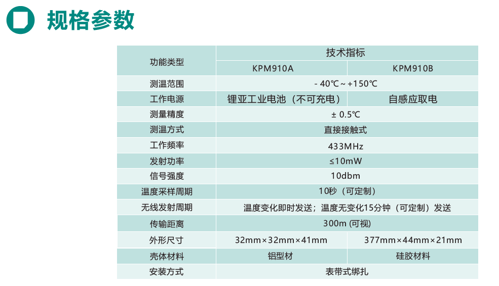 KPM910系列無線溫度傳感器直接安裝于被測物體表面,將模擬溫度數據轉化為數字信號,通過射頻信號發射至智能無線溫度采集儀,完成溫度數據的轉移測量。