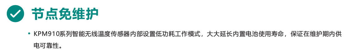 KPM910系列無線溫度傳感器可應用于高低壓配電柜、變壓器、電纜隧道、電纜橋架、旋轉設備、醫院、機房、冷鏈、冷藏等場合。