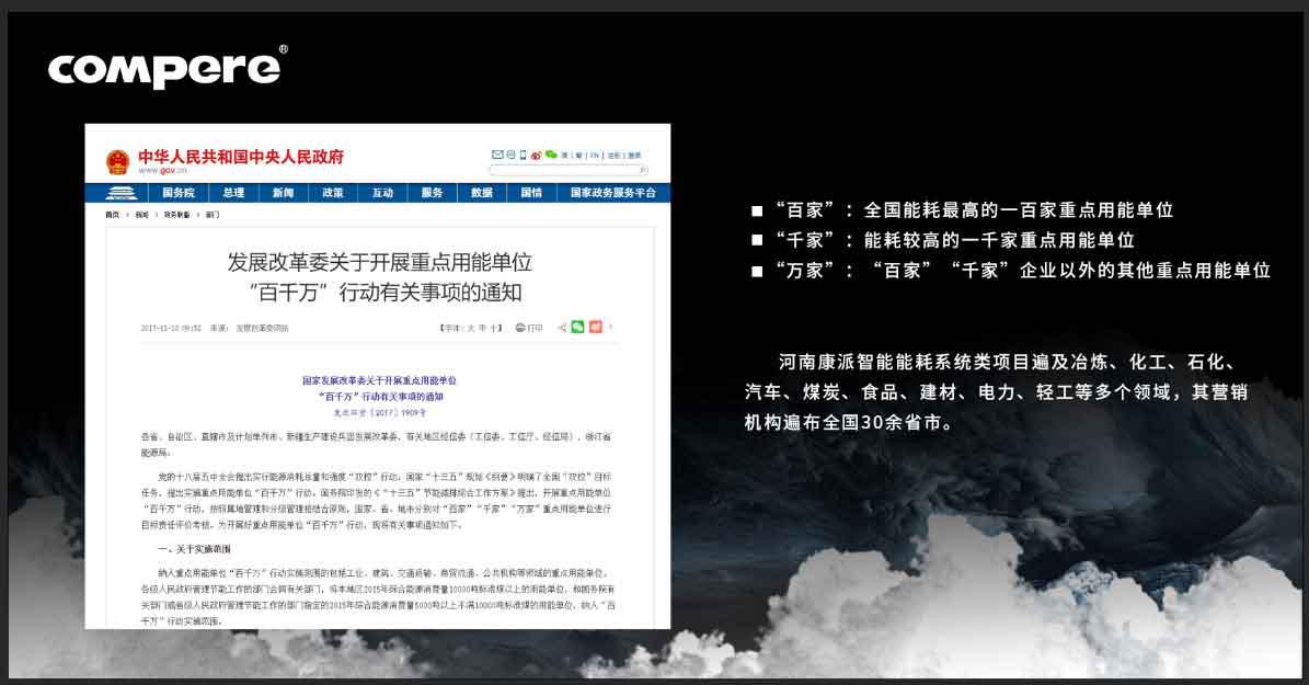 T@Energy-Online能耗在線監測系統,是康派智能自主研發的能耗監測系統,積極響應了國家發展改革委關于能耗在線監測系統推廣建設通知,在協助重點用能單位信息化轉型、促進節能增效并提升市場競爭力的同時,完成系統建設任務與數據上傳要求,通過政府驗收。