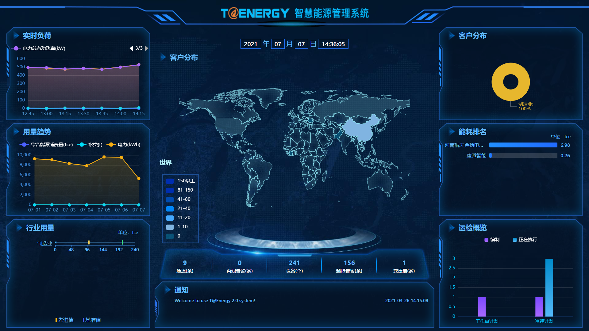 該功能包含對企業的用能分析、部門綜合能耗、設備用能分析、電量指標綜合分析四個方面,全方位的幫助企業對水、電、氣、暖多種能源介質進行統計分析,對比企業能耗情況與同期能耗的差異化情況,了解各個部門的綜合能耗情況,細致分析耗能設備的負荷率與耗能情況;并對使用電費的組成情況、電價時段、整體功率因數、設備負荷特性進行分析與展現。T@Energy 智慧能源管理系統的能耗分析功能能夠幫助用戶快速找到能耗的異常與設備耗能異常,幫助其發現節能空間,為節能方案提供科學的數據支持。